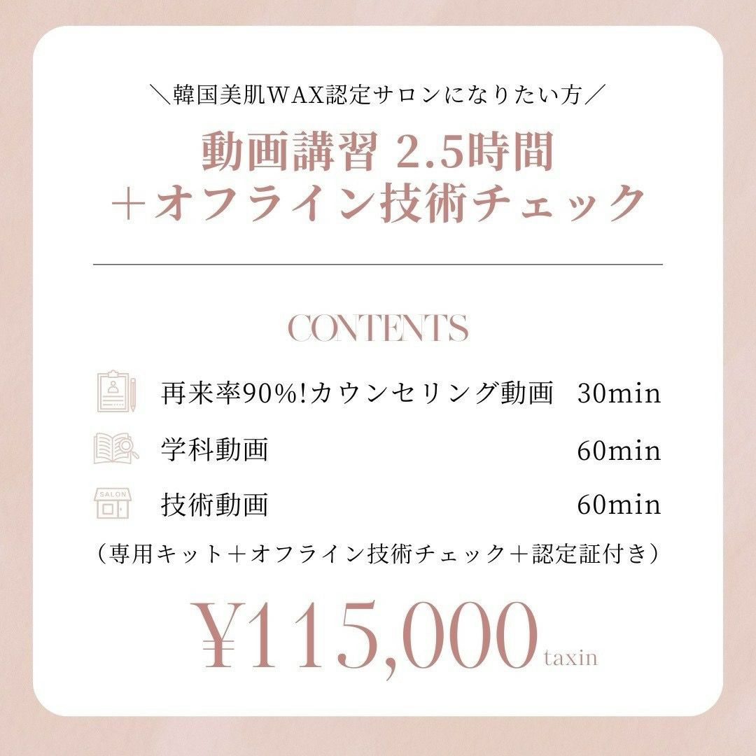 韓国美肌waxをサロンの美しい武器に。 リピート率アップのためのテクニカルカウンセリング、初めてでも取得できるクレンジングからワックス技術。基礎知識、基礎技術もしっかり動画で学習できます。